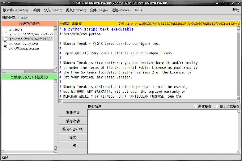 我现在就在研究 Tualatrix 兄的 ubuntu-tweak 的源代码,以前 ubuntu-tweak 托管于 Google Code 的时候,Google Code 对各版本差异分析得很清楚,然而转向 github 之后,限于网速,看起来很不方便。