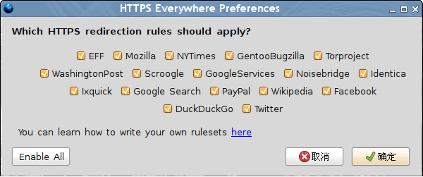 这里介绍的 HTTPS Everywhere 也是属于这类,不过它有更全的网站库,也不必像 GreaseMonkey 脚本一样要等到页面载入完成才行,下面简要介绍一下它吧。